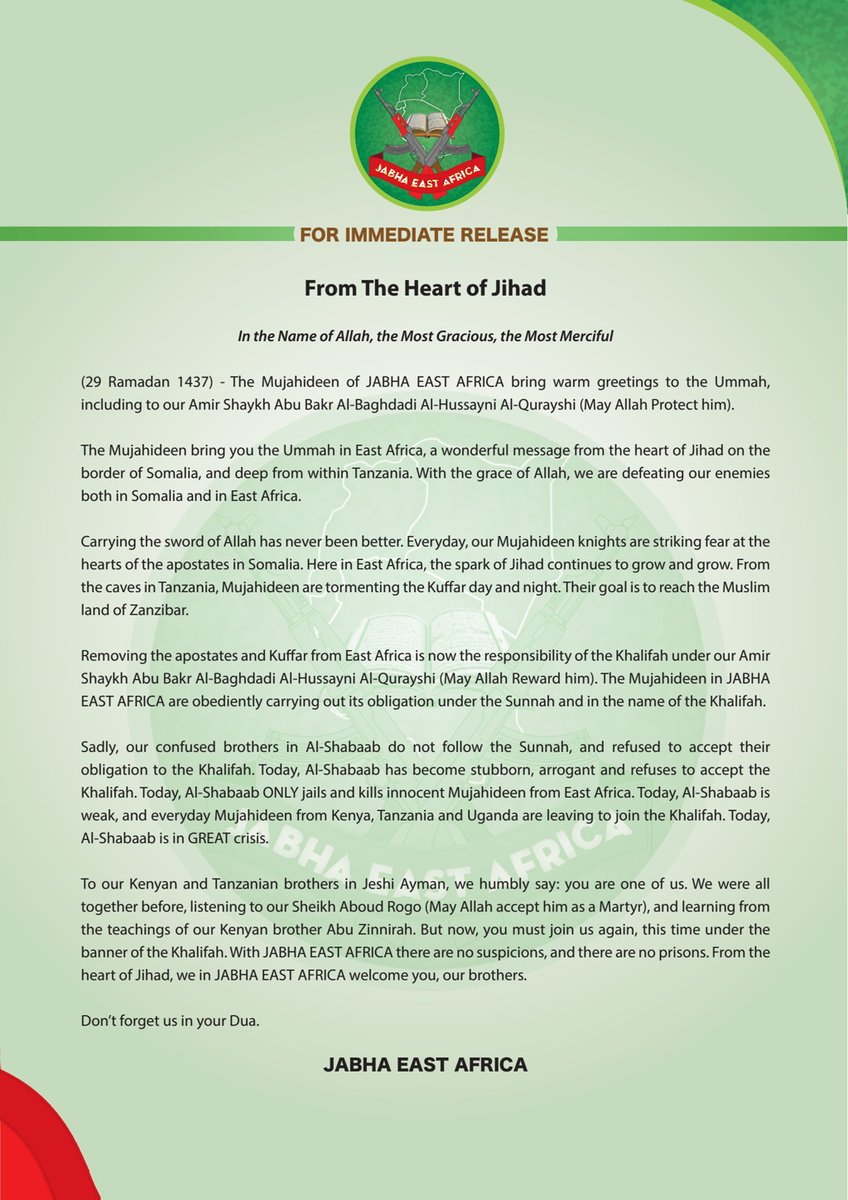 #Africa New Terrorist Group.#ISIS East Africa Front is about to wage #Jihad deep in #Tanzania & #Somalia Border. pic.twitter.com/Dm8gtBJUSr— Amor Shabbi عمر شابي (@AmorShabbi) July 4, 2016